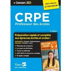 Le livre incontournable pour être 100 % efficace dans votre préparation au CRPE 2025 (M2) ! Préparez-vous efficacement pour réussir les épreuves écrites et orales (sauf options) du concours de professeur des écoles (Français, Mathématiques, Leçon et Entretien) en : vous informant avec une présentation du concours et des épreuves , faisant le point à l'aide d'un QCM général d'auto-évaluation assorti d'un bilan commenté en fonction des résultats du candidat lui permettant de s'orienter dans sa préparation , révisant avec un cours sous forme de 65 fiches synthétiques permettant d'aller à l'essentiel pour tout le programme , vous entraînant avec 350 QCM pour tester ses connaissances et 50 exercices corrigés prenant la forme de ceux rencontrés le jour J, altés par niveaux de difficulté , vous mettant en situation à l'aide de 9 sujets blancs et d'annales (dont les annales 2024), accompagnés d'astuces (gestion du temps, analyse du sujet, etc.) et de propositions de corrigés détaillés.
