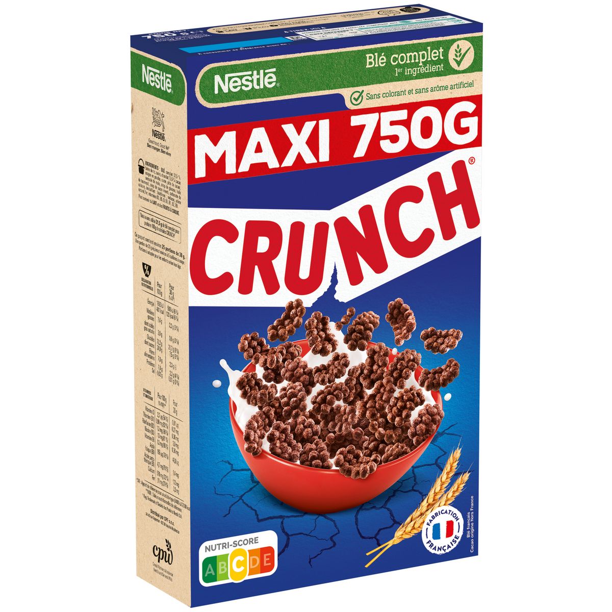 Ce paquet de céréales Crunch est produit dans notre usine de Haute-Savoie Rumilly. Fabrication française. Blé français, cacao origine hors France.