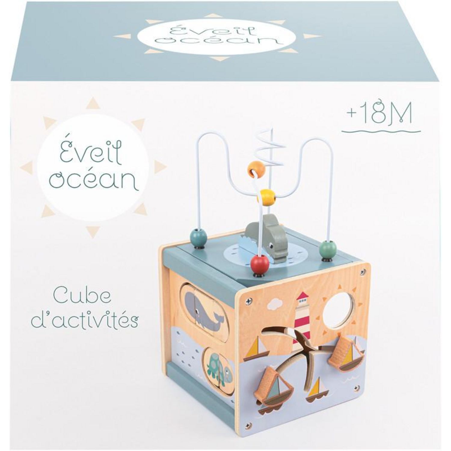 **CUBE BOIS ACTIVITÉS OCÉAN 18CM KABI 0151 – Jeu éducatif en bois pour l'éveil des tout-petits** **Réf. A2402176 | EAN 3437012421764** ---### 1. **Un cube d'activités ludique et éducatif** Ce cube en bois massif de 18 cm propose **5 faces d'éveil** sur le thème de l'océan, conçu pour stimuler la