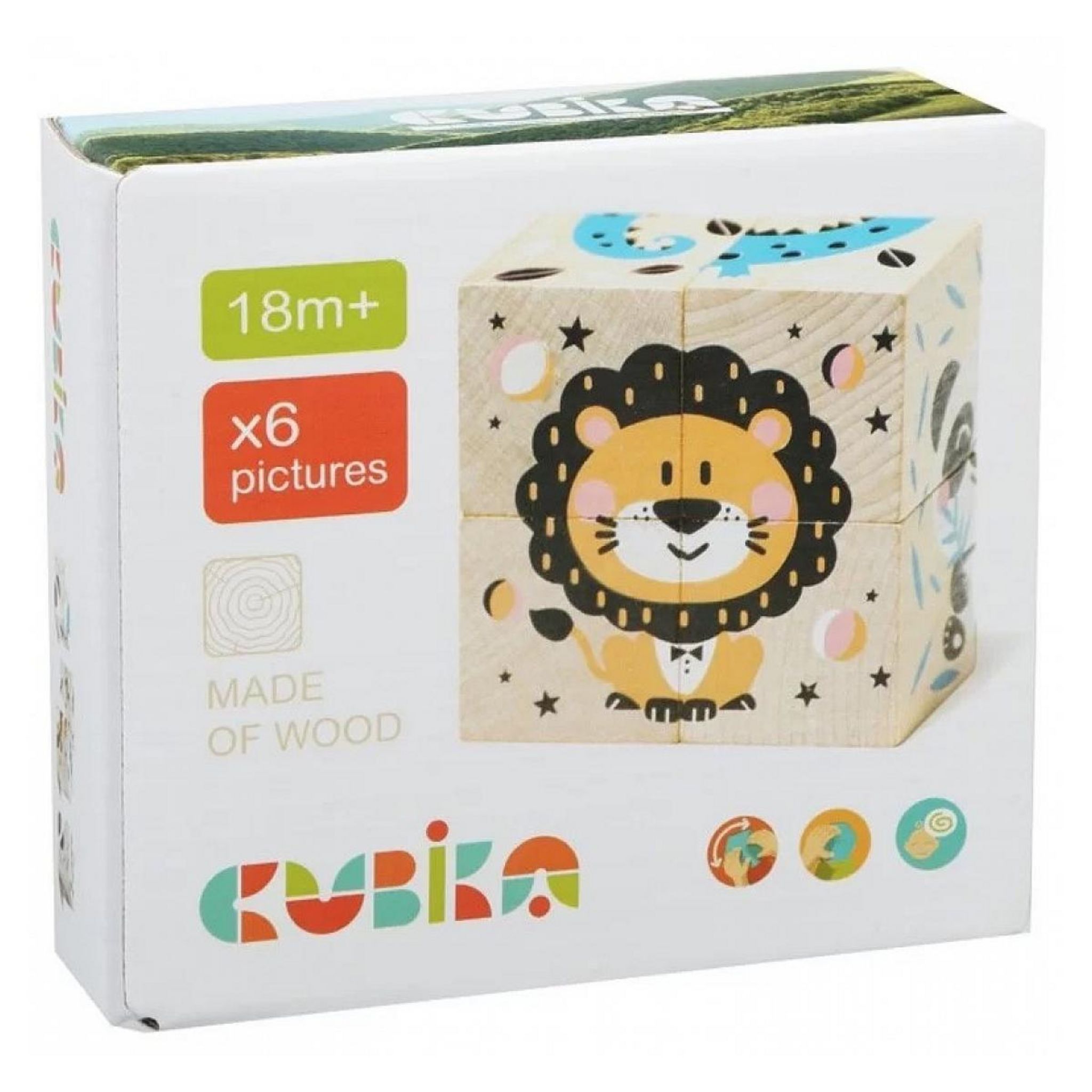 Ce puzzle permet de reconstituer 6x animaux en manipulant les 4 cubes en bois : un lion, un éléphant, un panda, un crocodile, un chien et un chat. Dès 18 mois.