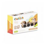 jouet de motricité en bois : un chien qui roule et tire un wagon qui transporte son chiot.