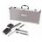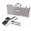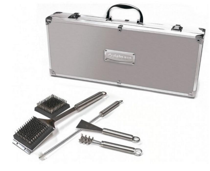 Cuisinart SBQ02E Set barbecue CUISINART SBQ02E. Comme les grands chefs qui ont besoin des meilleurs équipements pour cuisiner des plats savoureux, le cuisinier, même amateur, sera heureux d?avoir le meilleur matériel pour préparer de bons plats dans le jardin ou sur la terrasse. Des ingrédients de qualité n?y suffisent pas, ils méritent d?être préparés avec application. Cuisinart propose une gamme d?accessoires barbecue performante et élégante, qui ouvre les portes de l?imaginaire US !1 Mallette de rangement et de transport contient :7 ustensiles équipés d'un anneau d'accrochage.- Brosse métallique.- 2 Brosses métalliques de rechange.- Grattoir pour barbecue.- Brosse de nettoyage en fil de fer pour grille.- Brosse de nettoyage pour tube à gaz.- Chiffon microfibre.