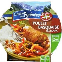 Haut de cuisse de poulet 36 %, riz précuit assaisonné 33% (huile de colza, sel), eau, poivrons rouges 7.2%, tomates 3.6%, oignons 3.6%, poivrons verts 2.7%, concentré de tomates, amidon modifié de maïs, fécule de pomme de terre, bouillon de volaille (Sel, dextrose de BLÉ, arômes naturels (GLUTEN) graisse de volaille, (antioxydant : extrait de romarin), oignon, épice), sucre, sel, colorant : extrait de paprika, piment fort, ail (SULFITES), poivre