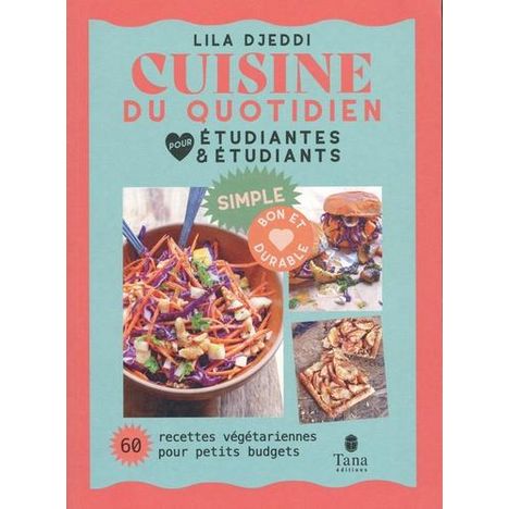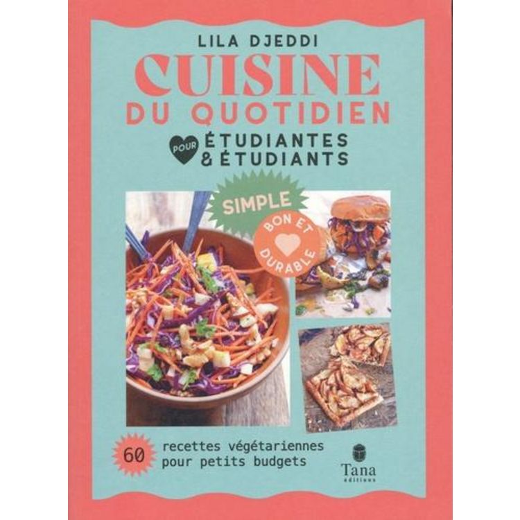 Houmous, bowl d'été, parmentier veggie, sandwich brioché aux légumes, velouté de butternut, mousse chocolat-cacahuètes, barres de céréales crues... 60 recettes végétariennes, durables, simplissimes et ultra-gourmandes, même quand on a un petit budget, peu d'ustensiles et qu'on part de zéro en cuisine ! Entre les cours, les révisions et les soirées entre potes, il n'est pas toujours facile de trouver le temps et la motivation de cuisiner. Lila Djeddi, cuisinière militante, a pensé à tout. Au menu, des petits plats veggies accessibles et savoureux prêts en deux temps trois mouvements, à manger en solo, à emporter ou à partager. Mais également des conseils et des astuces pour gagner du temps, gérer ses dépenses et se construire une culture culinaire engagée, sans stress et tout en se faisant plaisir. Mieux manger : toutes les clés pour choisir une alimentation moins sucrée et riche en protéines végétales, en céréales, en fruits et en légumes, en épices et en bons gras. Des techniques, des tours de main et toutes les variantes pour composer des assiettes complètes. Maitriser son budget : planifier ses courses, diversifier ses sources d'achats, éviter le gaspillage et manger sain et de saison, pour des recettes entre 0,90 et 2e la portion. S'organiser au quotidien : pour gagner du temps et être efficace en cuisine, des menus types pour la semaine, un calendrier des fruits et des légumes par mois, une initiation au batch cooking... S'équiper : les ustensiles indispensables pour tout faire dans un petit espace, des solutions pour une cuisine propre et un nettoyage écoresponsable, des astuces pour trier ses déchets. S'engager : un panorama des sources d'achats respectueuses de l'environnement pour comprendre les différents leviers de notre système alimentaire, repérer les labels à privilégier et apprendre à créer son groupement d'achats.