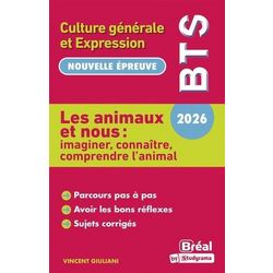 Une préparation efficace pour réussir l'épreuve de culture générale et expression du BTS 2026. Cet ouvrage vous propose : - Cinq études pour acquérir une culture générale sur le thème Les animaux et nous : imaginer, connaître, comprendre l'animal avec un cours accompagné de nombreux documents indispensables (textes et images). - Des conseils méthodologiques pour préparer l'examen écrit. - Des sujets guidés et corrigés pour s'entraîner avec efficacité.