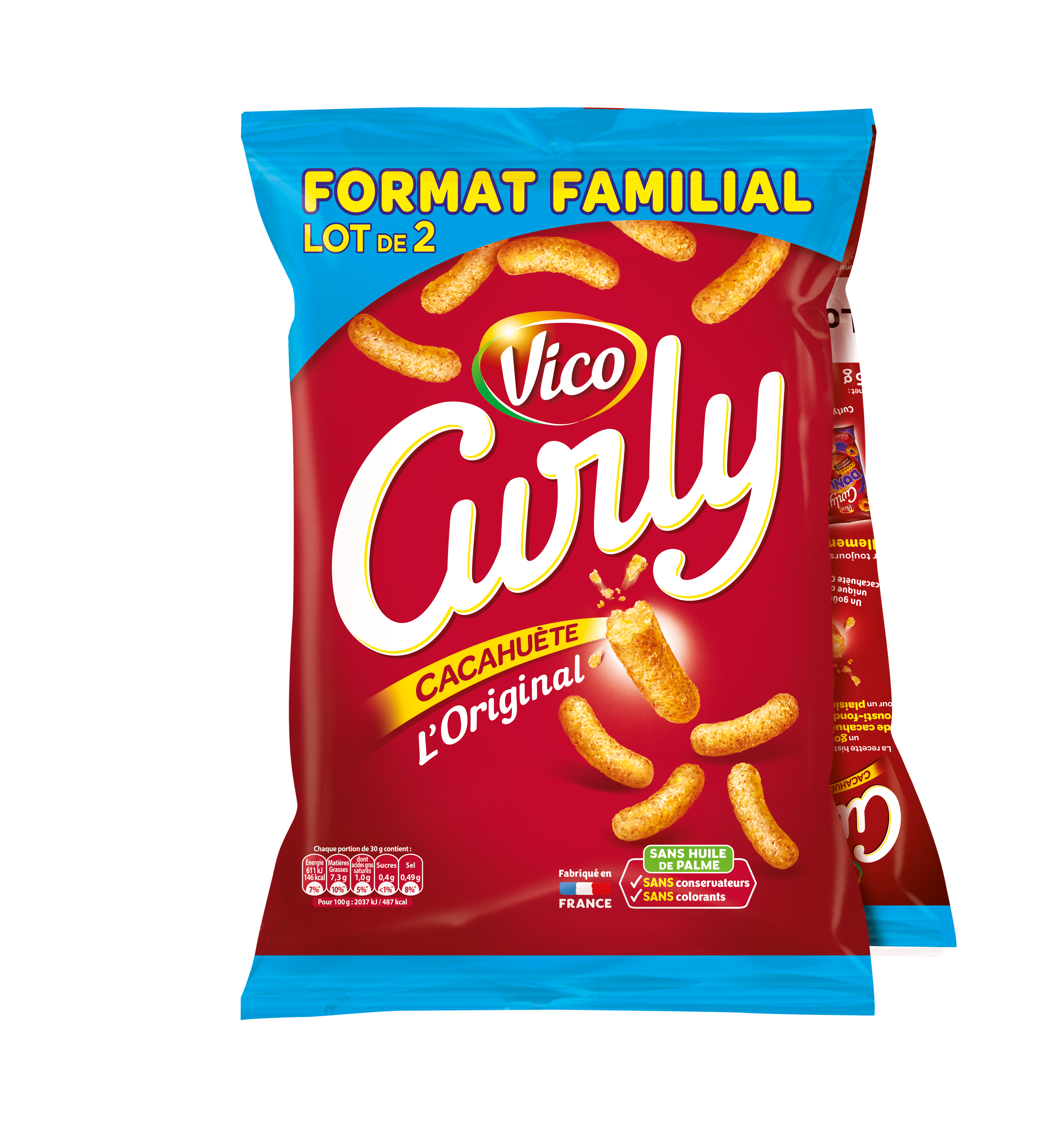 La recette historique et inimitable de Curly, pour un plaisir 100% gourmand ! Un goût unique de cacahuète et une texture crousti-fondante légère en bouche… pour un moment de plaisir inégalé ! Curly vous garantit des produits de qualité : - Fabriqués en France à partir de maïs français - Sans huile de palme - sans colorants - Sans conservateurs Curly met tout en œuvre pour vous garantir la meilleure qualité : - Des ingrédients sélectionnés : des cacahuètes grillées et moulues, de la semoule de maïs et un arôme naturel. - Une huile 100% tournesol. - Une fabrication sans colorant, sans conservateur. Produit soufflé à base de maïs.