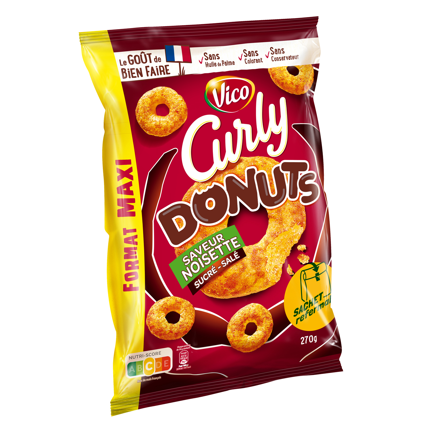 Une forme fun et ultra gourmande de donut déclinée sur une gamme de gout sucré-salé inédit… cacahuète caramélisée sucrée-salée et gout noisette sucré-salé Produit soufflé à base de maïs, saveur noisette sucrée-salée.