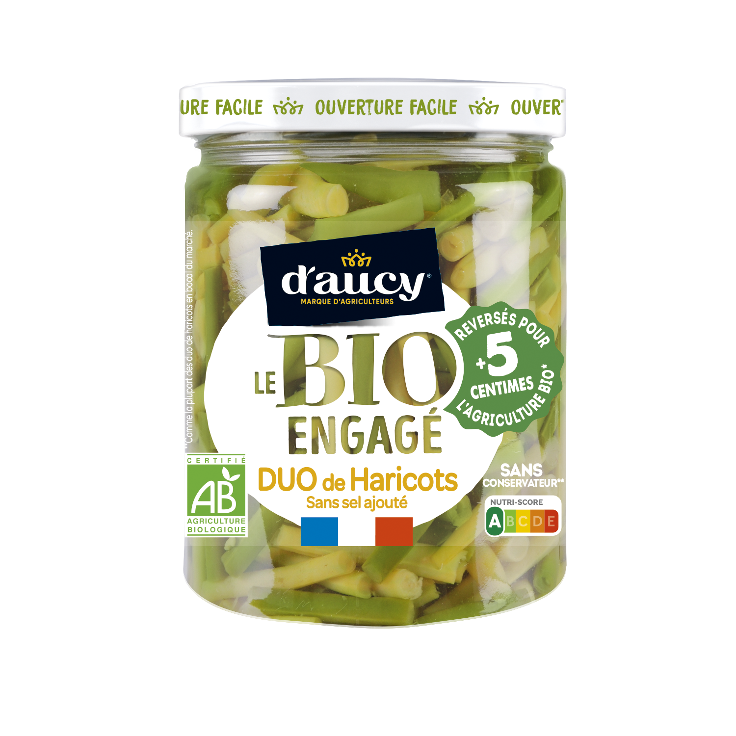 A assaisonner selon vos envies ! Légumes cultivés en plein champ +7 centimes sont reversés pour le bio. Retrouvez tous nos engagements sur daucy.fr Origine France Haricots beurre et haricots verts coupés sans sel ajouté issus de l’agriculture biologique