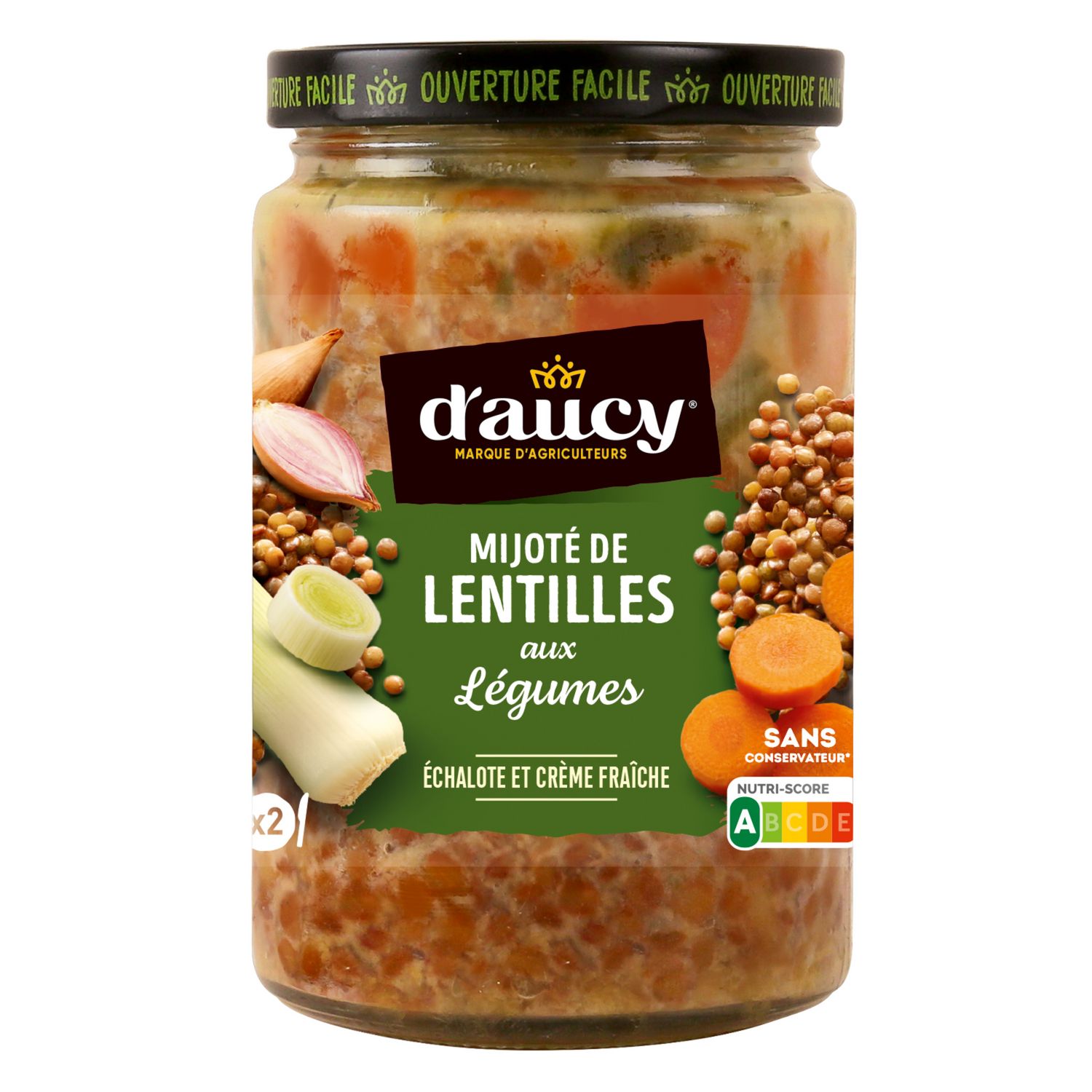 Lentilles (31%), eau, carottes, poireaux, CREME fraîche (lait) (4,7%), échalotes (4,2%), vin blanc, BEURRE concentrée (lait), sel, amidon, ail, épaississant : gomme guar, poivre.