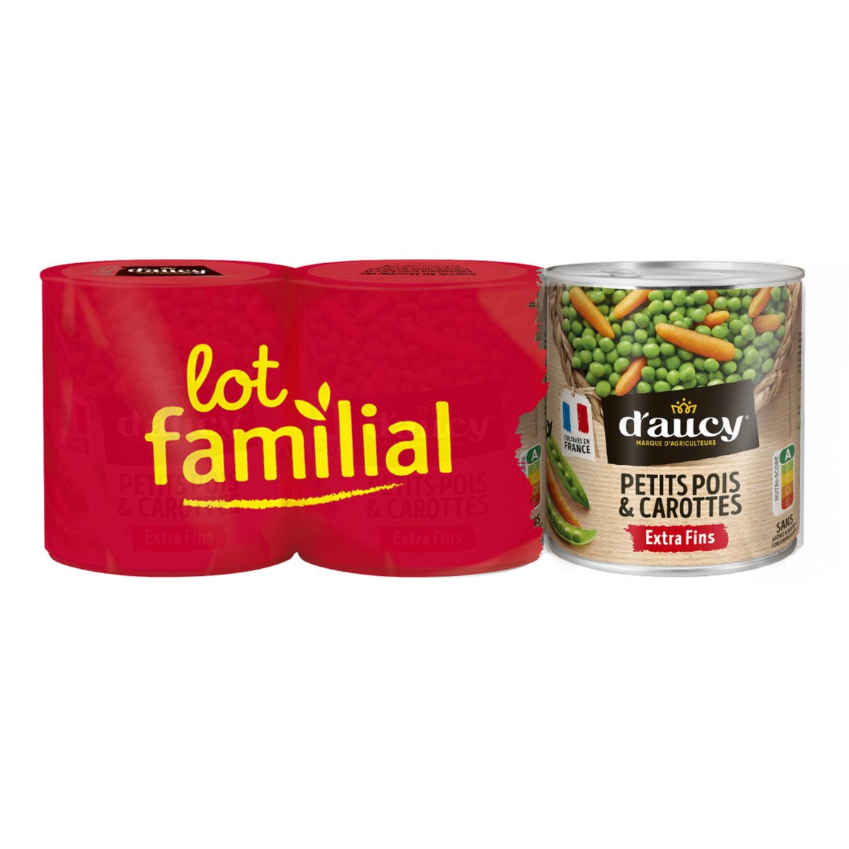 Légumes en proportion variable (petits pois, carottes), eau, sucre, sel. Ces petits pois et carottes sont cultivés en France.