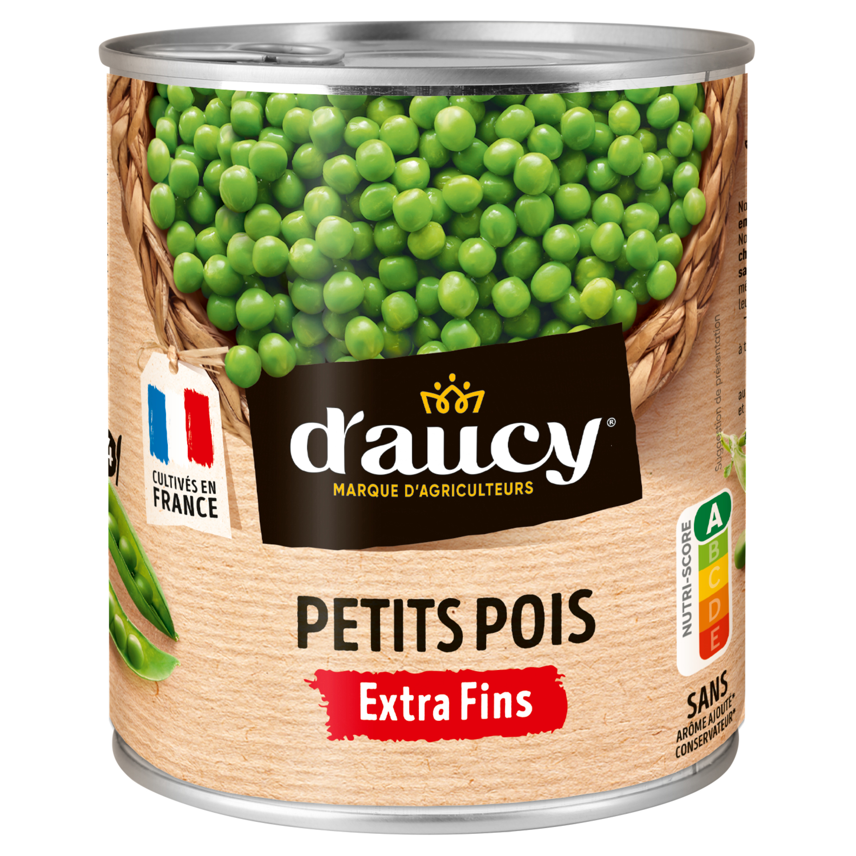 Petits pois, eau, sucre, sel. Ces petits pois sont cultivés en France.