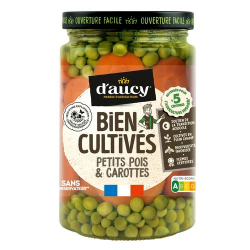 Nos petits pois et carottes Bien Cultivés d'aucy sont cultivés en plein champ en France, récoltés en saison et à bonne maturité. Ils sont issus d'une exploitation certifiée Haute Valeur Environnementale qui garantit des pratiques agricoles préservant l'écosystème naturel et l'environnement. Ces petits pois et carottes sont cultivés en France.