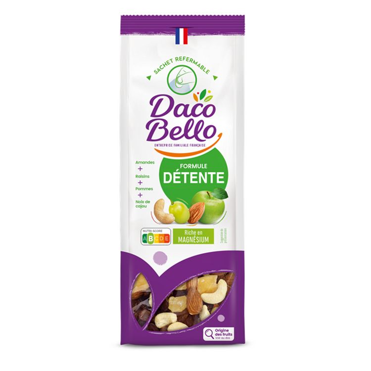 La formule Détente Daco Bello, gourmande et originale, met à l'honneur la pomme. Associée avec le croquant des amandes et des noix de cajou grillées et l'onctuosité des raisins, elle vous apportera l'assurance d'une journée paisible.