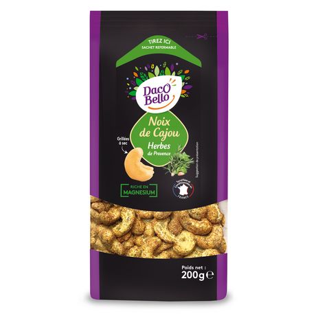 NOIX DE CAJOU grillées 90%, ail déshydraté 2.6%, poudre de toamtes (tomates, antiagglomérant: carbonate de magnésium), herbes de Provence 1.1%, poivre noir, sel, agent d'enrobage : gomme d'acacia