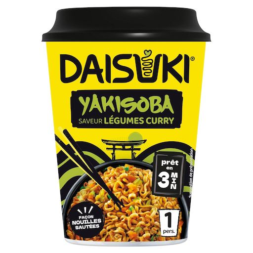 Découvrez DAISUKI Yakisoba, la nouvelle gamme nouilles instantanées façon nouilles sautées et inspirées de la street-food japonaise. Des nouilles instantanées aux recettes authentiques : Poulet Yakitori, Curry et légumes, Soja, super faciles à préparer grâce au couvercle égouttoir et prêtes en 3minutes ! Existent en format cup d'une portion. DAISUKI signifie j'adore en Japonais.