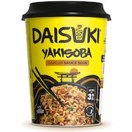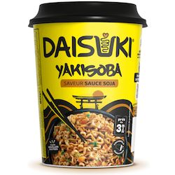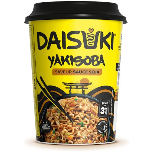 Découvrez DAISUKI Yakisoba, la nouvelle gamme nouilles instantanées façon nouilles sautées et inspirées de la street-food japonaise. Des nouilles instantanées aux recettes authentiques : Poulet Yakitori, Curry et légumes, Soja, super faciles à préparer grâce au couvercle égouttoir et prêtes en 3minutes ! Existent en format cup d'une portion. DAISUKI signifie j'adore en Japonais.