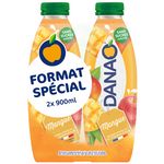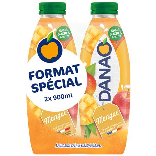 jus de fruits à base de concentrés 67.6% (pomme 56.7%, mangue 10.9%), LAIT écrémé 16%, eau, stabilisant : pectine de fruit, acidifiant : acide citrique, vitamines C et E, arômes naturels, colorants : carotènes, concentré (betterave rouge et cartotte)