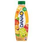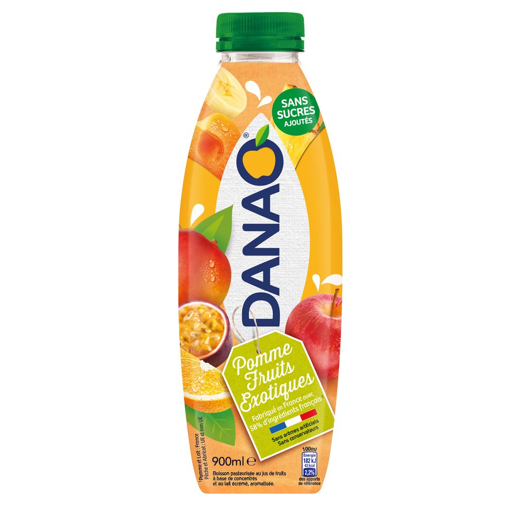 Jus de fruits à base de concentrés 74.3% (pomme 63.3%, orange 8.3%, fruit de la passion 1.9%, ananas 0.4%, abricot 0.1%, banane 0.1%, mangue 0.1%, citron 0.1%), LAIT écrémé 16%, eau, stabilisant : pectine de fruit, vitamines C et E, arômes naturels, acidifiant : acide citrique, colorant : carotènes.