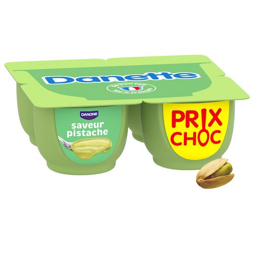 Danette crème dessert saveur pistache c'est de la crème et du bon lait français* avec une délicieuse saveur de pistache et toujours la petite touche de bonne humeur qui va avec. Fabriquée dans nos laiteries de Saint-Just-Chaleyssin (38) et de Bailleul (59), cette crème saveur pistache à la texture onctueuse est Idéale pour un dessert gourmand en fin de repas. Danette, c'est la crème dessert pour laquelle tout le monde est toujours debout! *Ajout de lait écrémé concentré ou en poudre (Origine: UE)