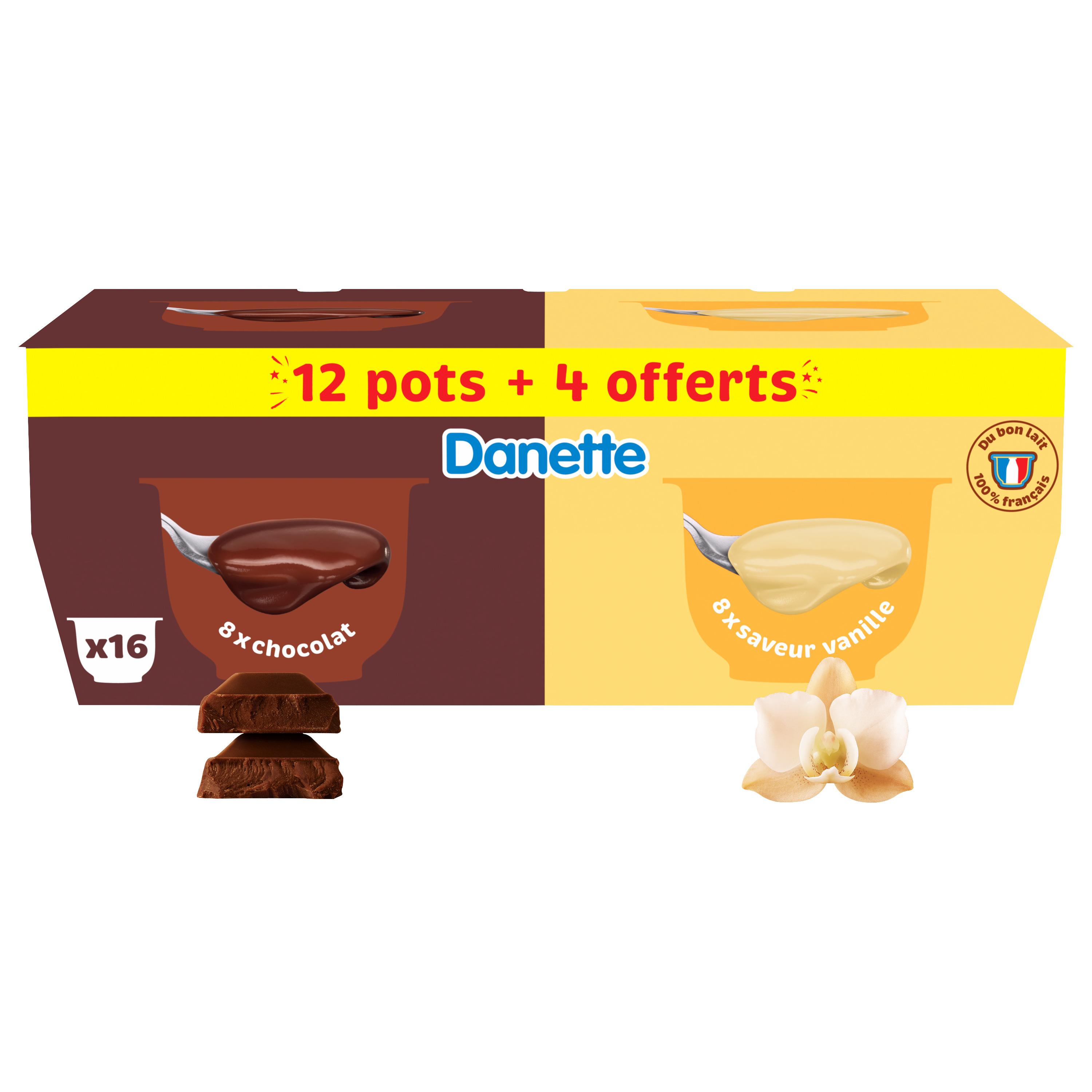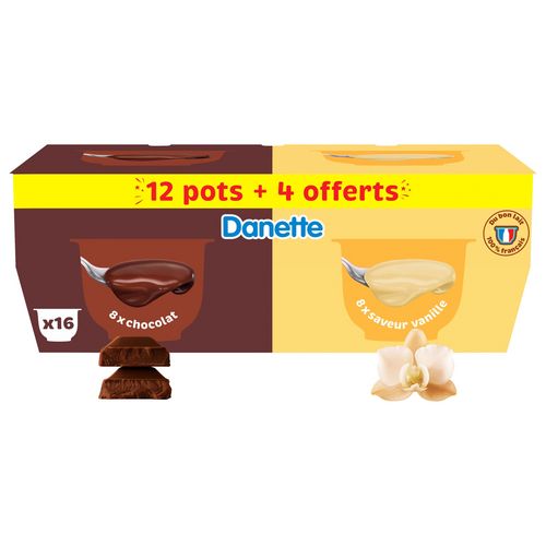 Danette Chocolat : LAIT demi-écrémé (76,9%), sucre, crème (LAIT), cacao maigre, chocolat (2%) (sucre, pâte de cacao, cacao maigre, émulsifiant (lécithine de SOJA), arôme), épaississants (amidon transformé, carraghénanes), lactosérum en poudre (LAIT), LAIT écrémé concentré ou en poudre, amidon. Danette vanille : LAIT entier (82,8%), sucre, LAIT écrémé concentré ou en poudre, épaississants (amidon transformé, carraghénanes), lactosérum en poudre (LAIT), amidon, arôme (LAIT), colorant (bêta-carotène). Lait : Origine France