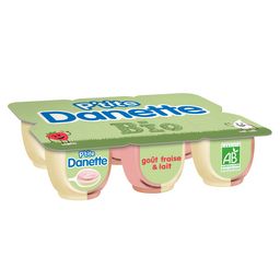Crème dessert au lait et à l'arôme naturel de fraise Les enfants ont aussi leur Danette au gout naturel de fraise, et elle est bio ! Toute l'onctuosité de notre crème dessert Danette avec du bon lait 100% bio, dans des petits pots pour se faire plaisir juste ce qu'il faut. Fabriqué en France avec du bon lait français ce dessert doux et gourmand 100% bio fera le bonheur de vos enfants.