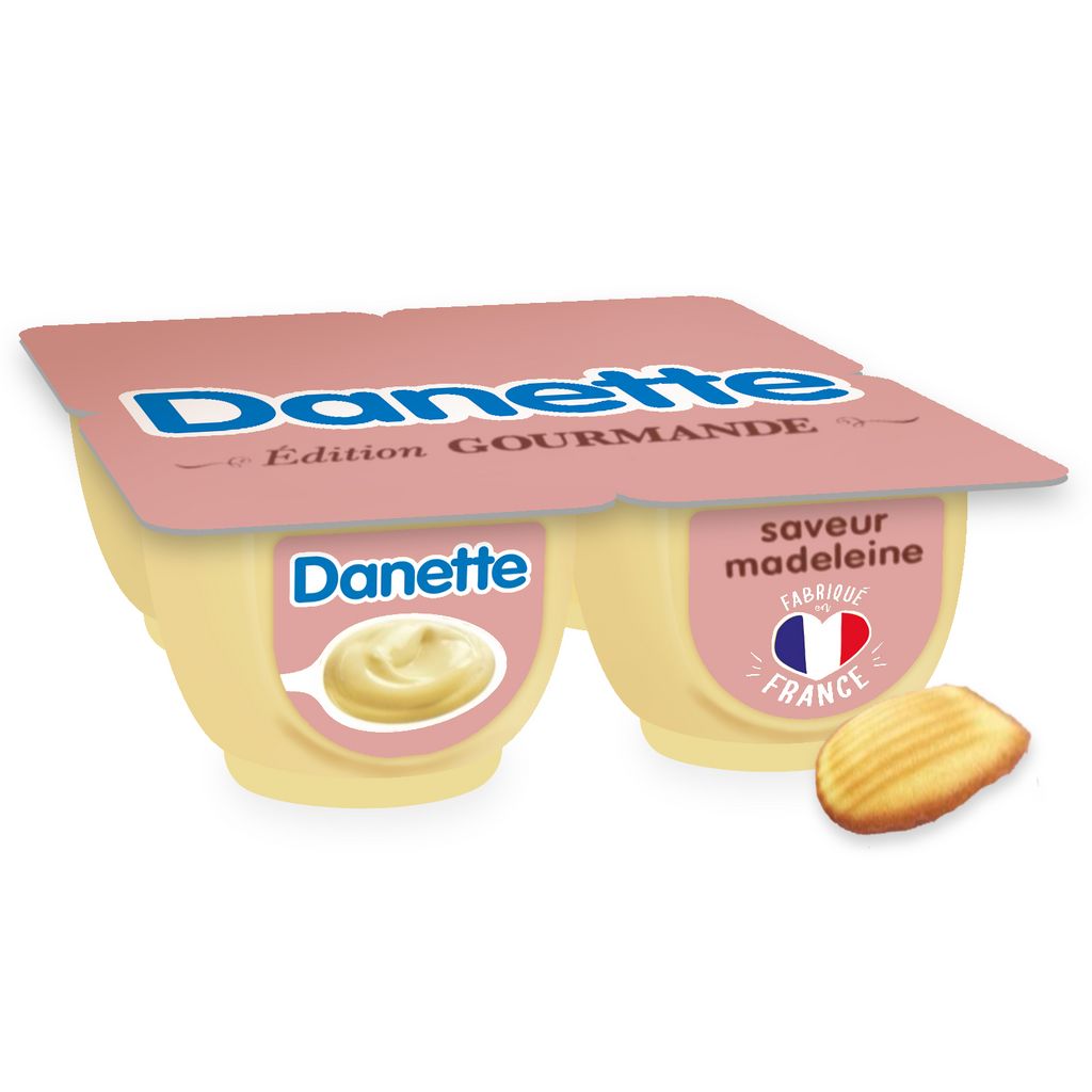 Danette crème dessert saveur madeleine c'est de la crème et du bon lait français avec une délicieuse saveur de madeleine et toujours la petite touche de bonne humeur qui va avec. Fabriquée dans notre laiterie de Saint-Just-Chaleyssin (38), cette crème saveur madeleine à la texture onctueuse est Idéale pour un dessert gourmand en fin de repas. Danette, c'est la crème dessert pour laquelle tout le monde est toujours debout! *Ajout de lait écrémé concentré ou en poudre (Origine: UE)