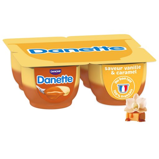 Danette crème dessert double saveur vanille lit caramel c'est de la crème et du bon lait français* avec une délicieuse saveur de vanille sur un lit de caramel et toujours la petite touche de bonne humeur qui va avec. Fabriquée dans nos laiteries de Saint-Just-Chaleyssin (38) et de Bailleul (59), cette crème dessert vanille lit caramel à la texture onctueuse est Idéale pour un dessert gourmand en fin de repas. Danette, c'est la crème dessert pour laquelle tout le monde est toujours debout! *Ajout de lait écrémé concentré ou en poudre (Origine: UE)