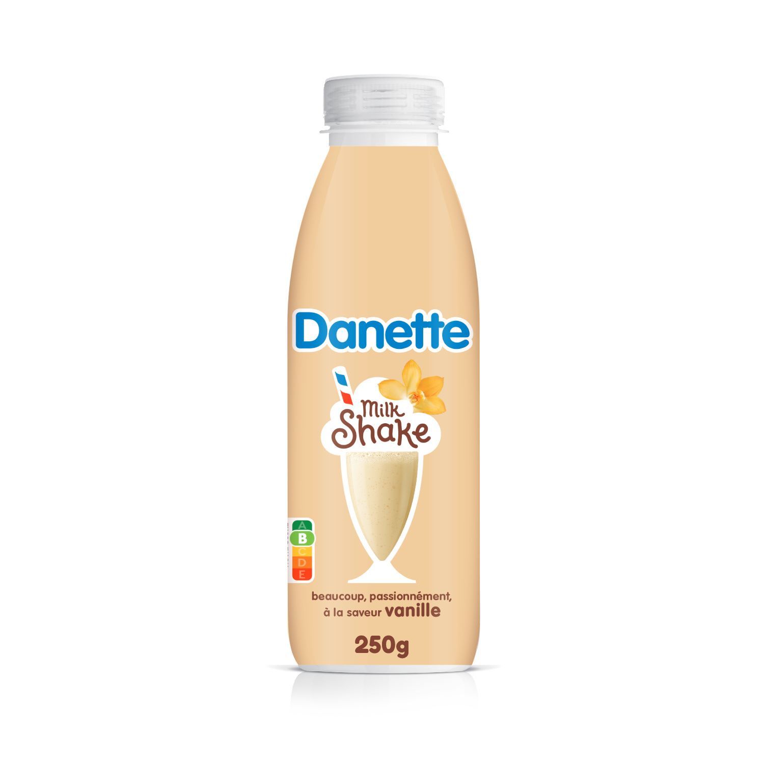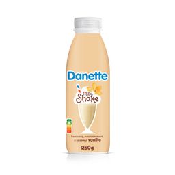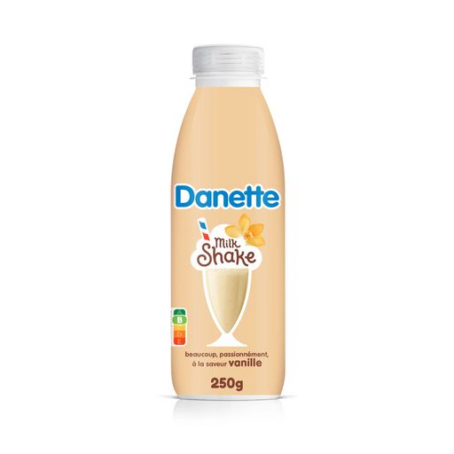 Danette à boire Milkshake saveur vanille c'est la rencontre du bon lait français mélangé et mixé au délicieux goût vanille pour une boisson à la texture gourmande et onctueuse. Une recette conçue en France dans une bouteille recyclable avec 50% de RPet. La boisson Danette Milkshake c'est un format à emporter partout, un encas ou un dessert à consommer frais et TOUJOURS DEBOUT !