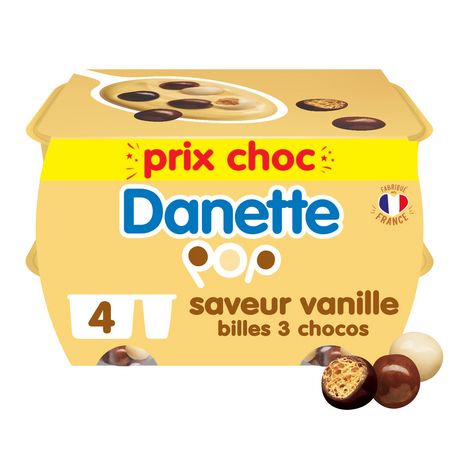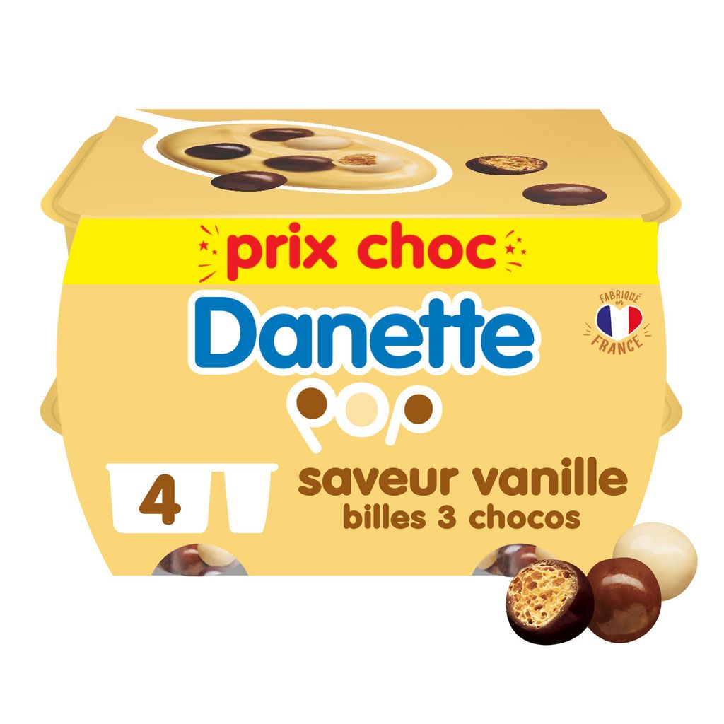 Ingrédients : Crème dessert aromatisée saveur vanille LAIT demi écrémé et LAIT écrémé en poudre (75,6%) sucre (8,3%) crème (LAIT) épaississants :E 1442 (amidon transformé), E 407 (carraghénanes) perméat de petit LAIT (lactosérum) en poudre arôme (LAIT) amidon colorant : E 160a (Beta carotène) Billes soufflées enrobées de 3 chocolats (6,8%) billes soufflées 2,7% (farine de BLÉ, sucre, malt de BLÉ, poudre à lever : E 500 (carbonate de sodium), huile de tournesol, sel, dextrose) chocolat 1,4% (pate de cacao, sucre, beurre de cacao, émulsifiant : lécithine de SOJA, arôme) chocolat blanc 1,4% (sucre, beurre de cacao, poudre de LAIT entier, poudre de lactosérum (LAIT), émulsifiant : lécithine de SOJA, arôme) chocolat au LAIT 1,3% (sucre, beurre de cacao, poudre de LAIT entier, pâte de cacao, émulsifiant : lécithine de SOJA, arôme) agent d'enrobage : E 414 (gomme arabique)