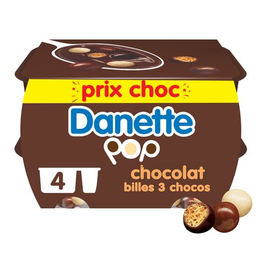 Ingrédients : Crème dessert au chocolat LAIT demi écrémé (72,3%) sucre (10,3%) crème (LAIT) chocolat (1,9%) (sucre, pâte de cacao, cacao maigre en poudre, émulsifiant : lécithine de SOJA, arôme) cacao maigre en poudre épaississants: E 1442 (amidon transformé), E 407 (carraghénanes) perméat de petit LAIT (lactosérum) en poudre amidon Billes soufflées enrobées de 3 chocolats (6,8%) billes soufflées 2,7% (farine de BLÉ, sucre, malt de BLÉ, poudre à lever : E 500 (carbonate de sodium) , huile de tournesol, sel, dextrose) chocolat noir 1,4% (pate de cacao, sucre, beurre de cacao, émulsifiant : lécithine de SOJA, arôme) chocolat blanc 1,4% (sucre, beurre de cacao, poudre de LAIT entier, poudre de lactosérum (LAIT),émulsifiant : lécithine de SOJA, arôme) chocolat au LAIT 1,3% (sucre, beurre de cacao, poudre de LAIT entier, pâte de cacao, émulsifiant : lécithine de SOJA, arôme) agent d'enrobage : E 414 (gomme arabique)