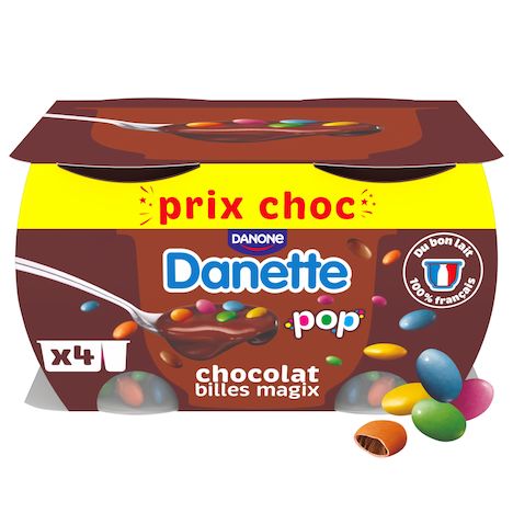 Danette POP chocolat c'est de délicieuses billes chocolatées multicolores à verser dans votre crème dessert chocolat Danette. Fabriquée dans notre laiterie de Le-Molay-Littry (14) avec du bon lait français, cette onctueuse crème chocolat se déguste avec ses billes colorées croustillantes. Un dessert ludique et gourmand à partager pour petits et grands! Danette, c'est le dessert pour lequel tout le monde est toujours debout!