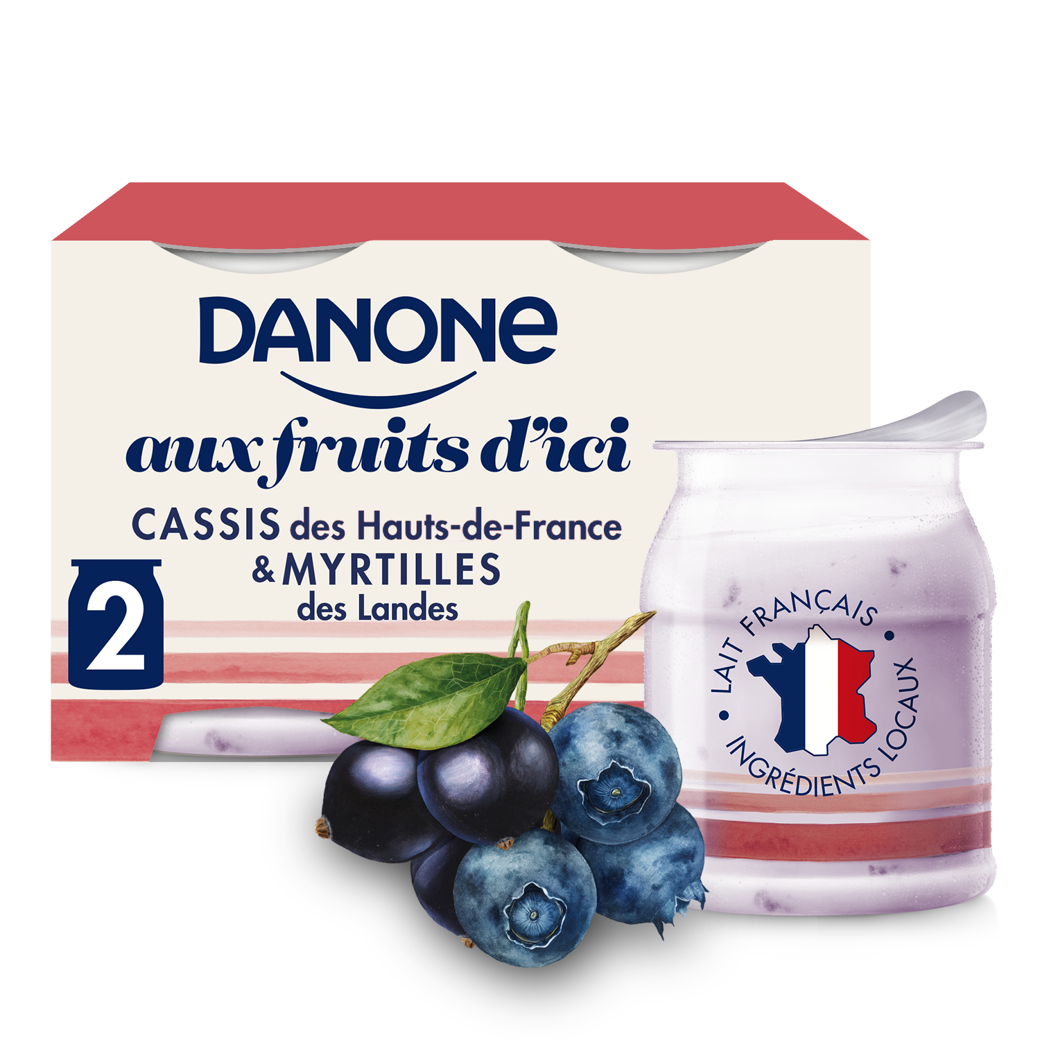 Yaourt sucré à la myrtille et au cassis Un yaourt aux fruits simple et local qui vit au rythme des récoltes de nos producteurs : du lait et des ferments français, des variétés de fruits de nos régions, du sucre français Rien de plus. Le tout dans un nouveau pot transparent fait de 30% de PET recyclé. Produit dans notre laiterie de Villecomtal-sur-Arros (32)