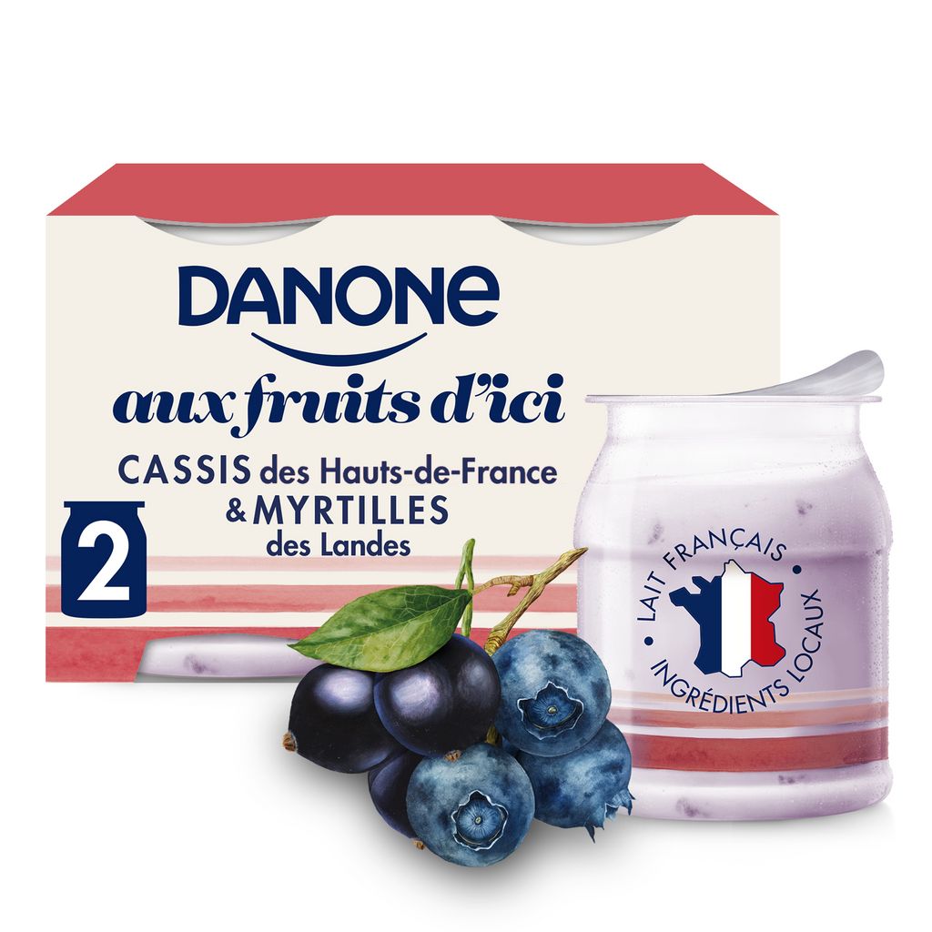 yaourt (LAIT entier (63,2%), LAIT écrémé concentré ou en poudre (11,1%),crème (LAIT) (1,9%), ferments lactiques (LAIT)) myrtille (8,0%) cassis(8,0%) sucre (6,3%) LAIT : Origine France