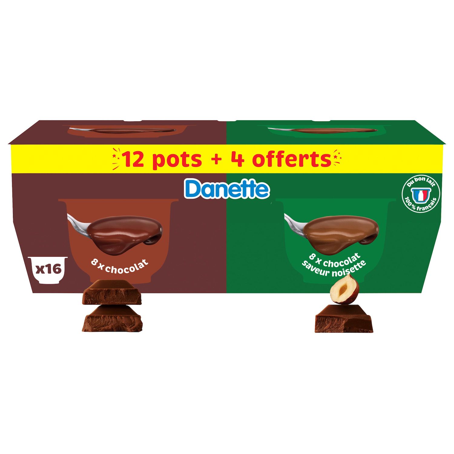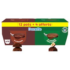 Danette Choco Noisettes :LAIT entier (71,2%), sucre, crème (LAIT), cacao maigre, LAIT écrémé concentré ou en poudre, chocolat (2%) (sucre, pâte de cacao, cacao maigre, émulsifiant (lécithine de SOJA), arôme), lactosérum en poudre (LAIT), épaississants (amidon transformé, carraghénanes), amidon, arôme. Danette Chocolat : LAIT demi-écrémé (76,9%), sucre, crème (LAIT), cacao maigre, chocolat (2%) (sucre, pâte de cacao, cacao maigre, émulsifiant (lécithine de SOJA), arôme), épaississants (amidon transformé, carraghénanes), lactosérum en poudre (LAIT), LAIT écrémé concentré ou en poudre, amidon. Lait : Origine France