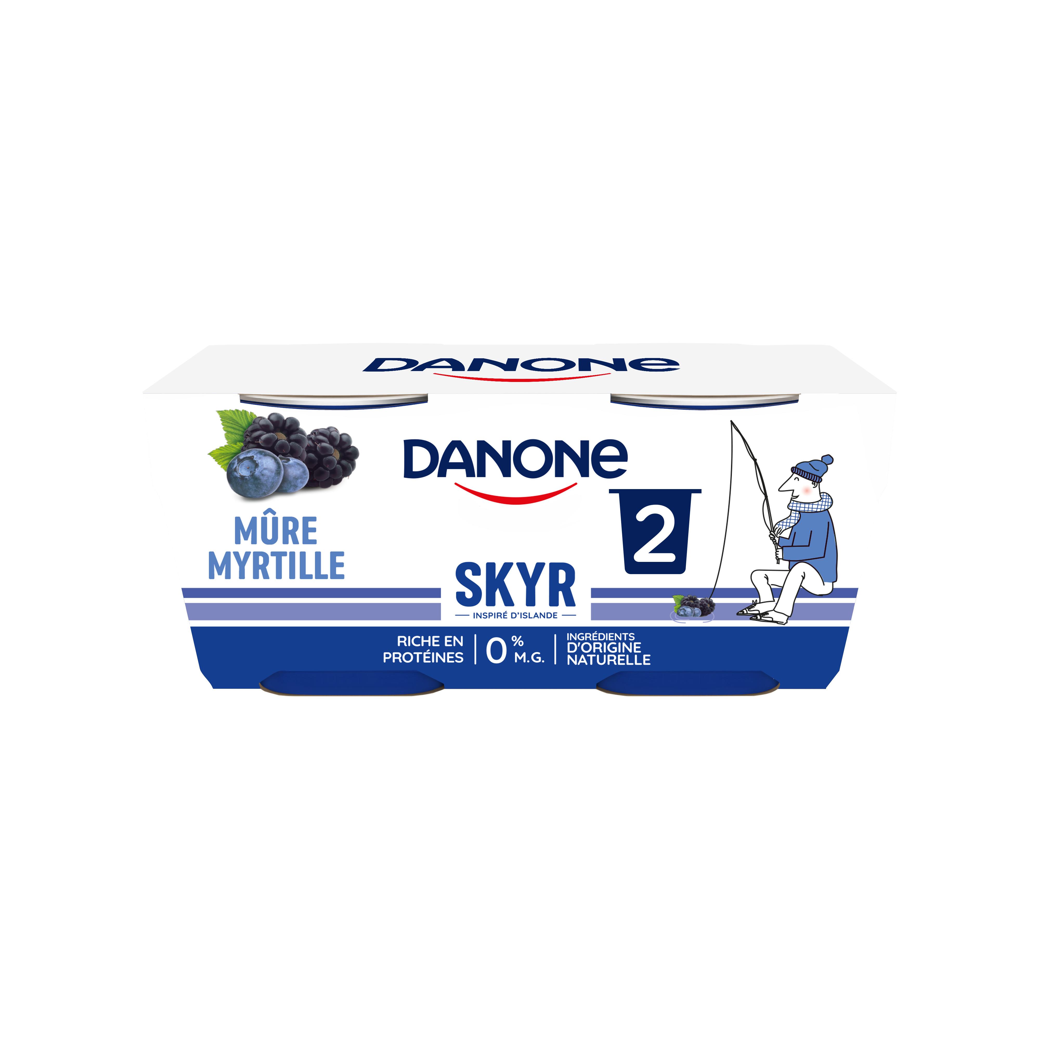 Danone Skyr L'Original, inspiré de la recette traditionnelle islandaise. Naturellement riche en protéines pour 0% de matières grasses, le skyr Danone Mûre Myrtille est fabriqué à partir d'ingrédients d'origine naturelle. Selon la légende, le skyr a été importé en Islande il y a plus de 1000 ans !