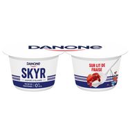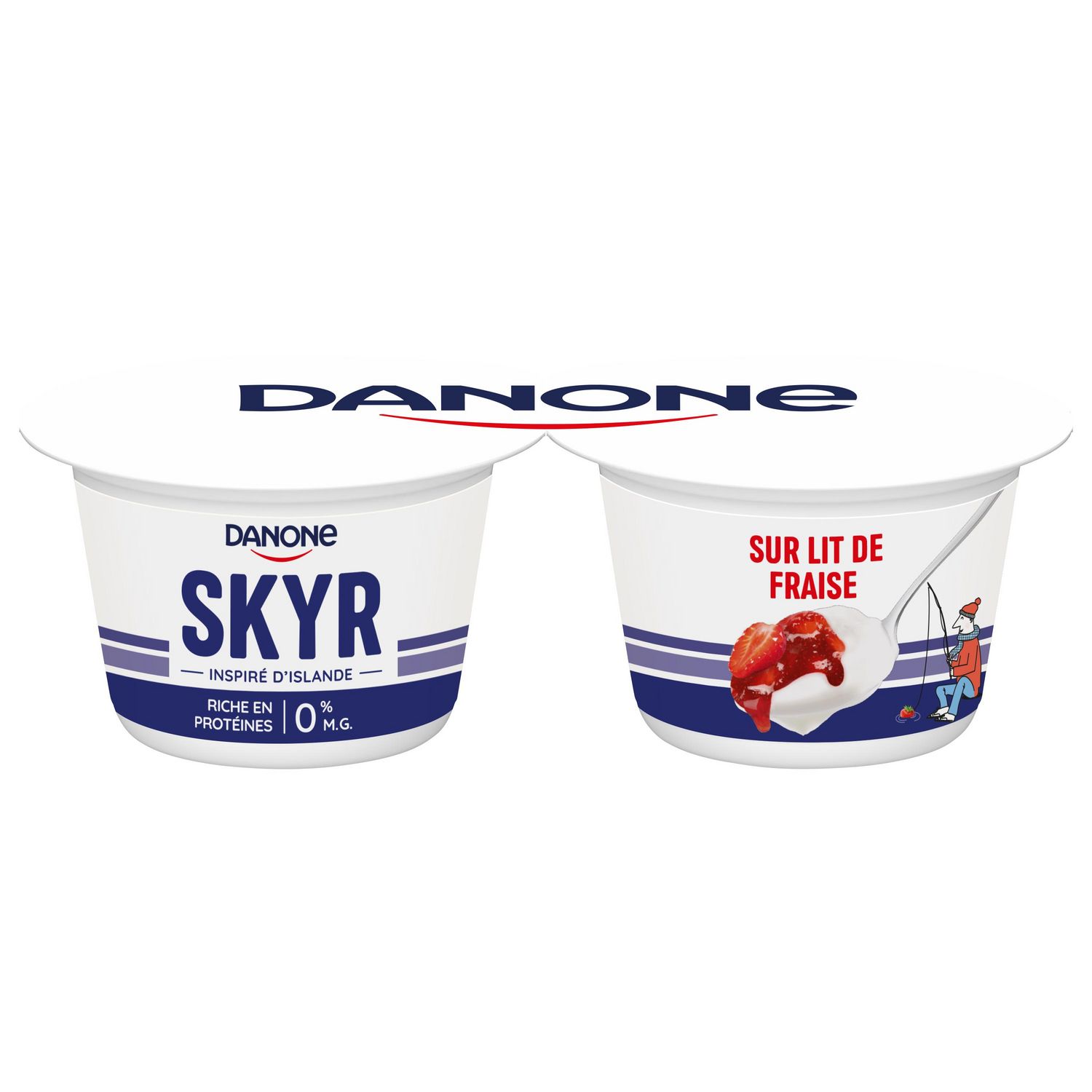 Danone Skyr, inspiré d'Islande. Naturellement riche en protéines pour 0% de matières grasses, le skyr Danone sur lit de fraise est fabriqué en France, avec du bon lait 100% français. Selon la légende, le skyr a été importé en Islande il y a plus de 1000 ans !