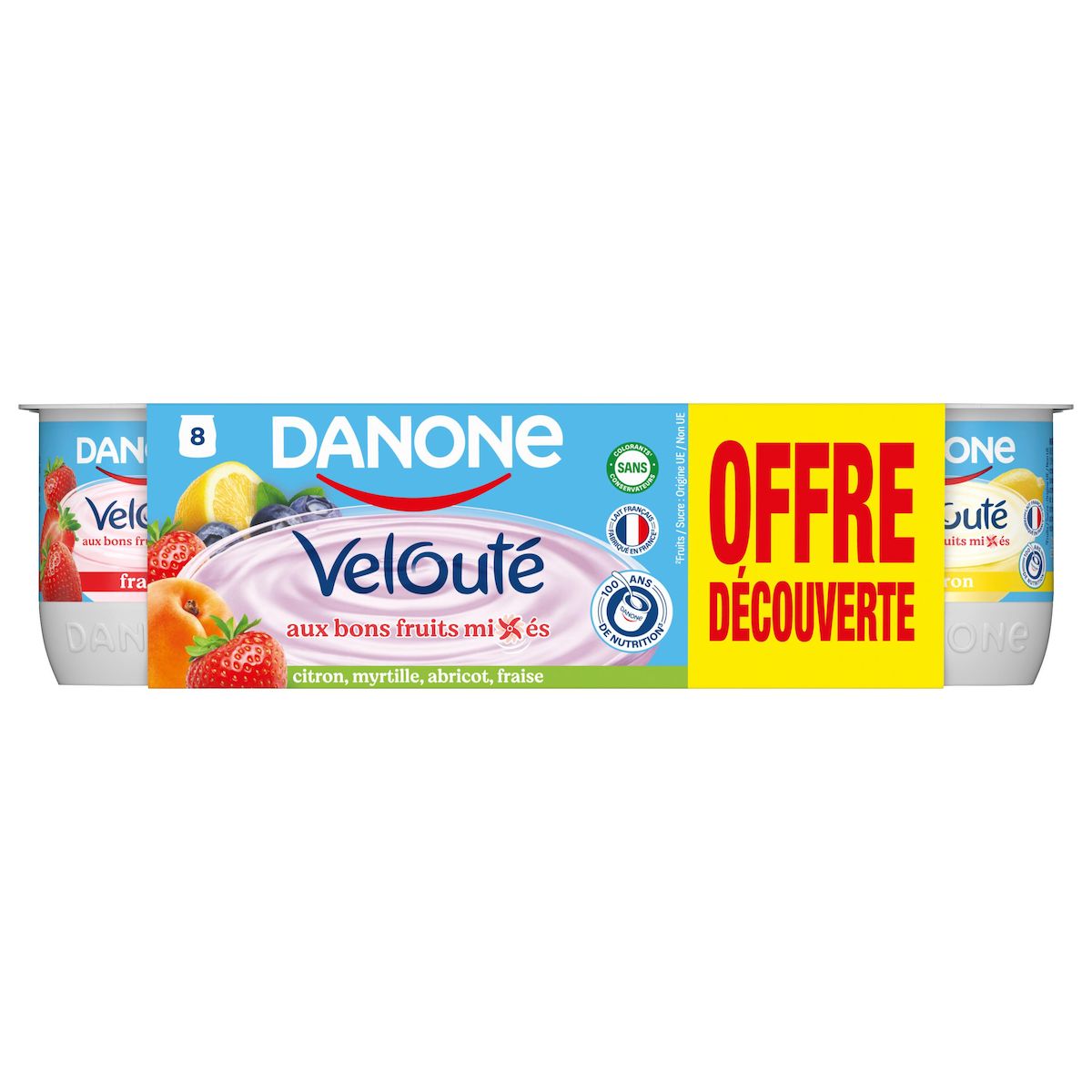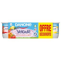 "Danone Velouté aux bons fruits mixés, c'est un yaourt brassé aux fruits à la texture onctueuse. Il est fabriqué avec des ingrédients d'origine 100% naturelle: du bon lait, un mix exclusif de ferments et une petite touche de crème. Il vous apporte tous les bienfaits du calcium et des protéines*, des nutriments essentiels pour prendre soin de vous et de ceux que vous aimez* depuis plus de 100 ans. *Le yaourt Danone Velouté aux bons fruits mixés est source de calcium, qui est nécessaire au maintien d'une ossature normale. Il est également source de protéines qui contribuent au maintien de la masse musculaire."
