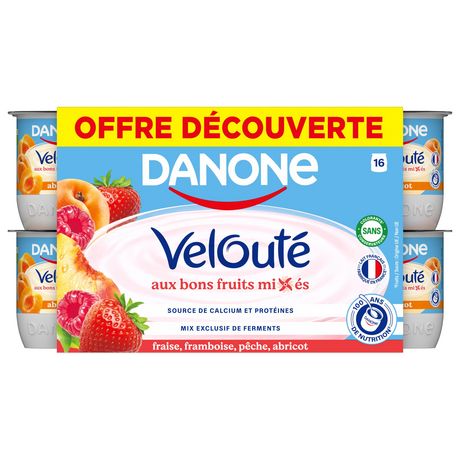 "Danone Velouté aux bons fruits mixés, c'est un yaourt brassé aux fruits à la texture onctueuse. Il est fabriqué avec des ingrédients d'origine 100% naturelle: du bon lait, un mix exclusif de ferments et une petite touche de crème. Il vous apporte tous les bienfaits du calcium et des protéines*, des nutriments essentiels pour prendre soin de vous et de ceux que vous aimez* depuis plus de 100 ans. *Le yaourt Danone Velouté aux bons fruits mixés est source de calcium, qui est nécessaire au maintien d'une ossature normale. Il est également source de protéines qui contribuent au maintien de la masse musculaire."