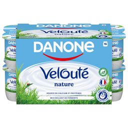 "Velouté Nature, c'est un yaourt brassé nature à la texture onctueuse. Il est fabriqué avec des ingrédients d'origine 100% naturelle: du bon lait, un mix exclusif de ferments et une petite touche de crème. Il vous apporte tous les bienfaits du calcium et des protéines*, des nutriments essentiels pour prendre soin de vous et de ceux que vous aimez* depuis plus de 100 ans. *Le yaourt Velouté Nature est source de calcium, qui est nécessaire au maintien d'une ossature normale. Il est également source de protéines qui contribuent au maintien de la masse musculaire."