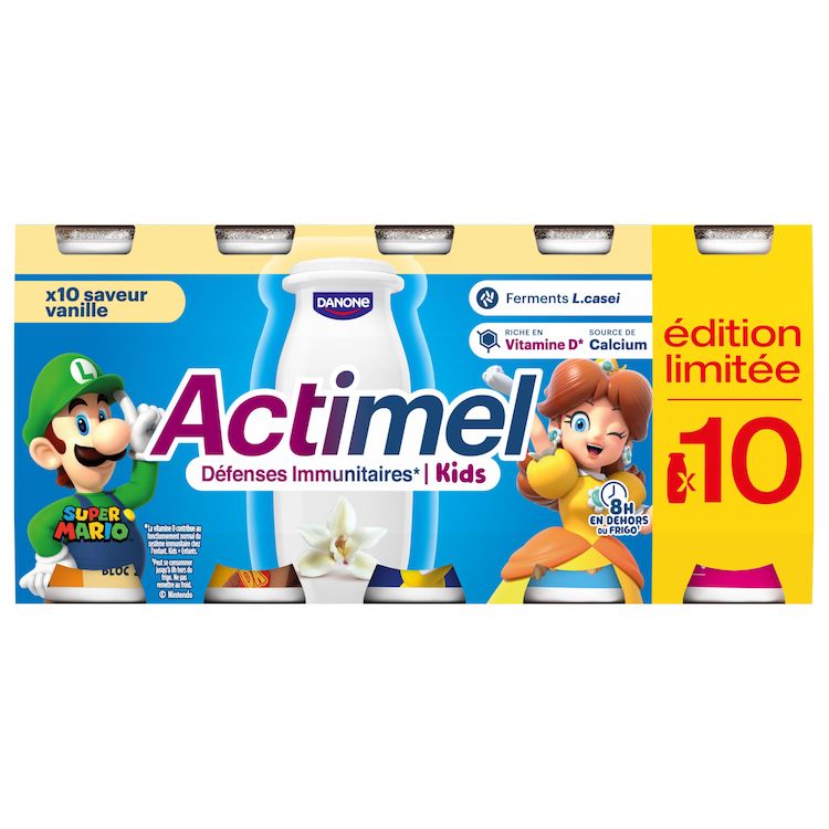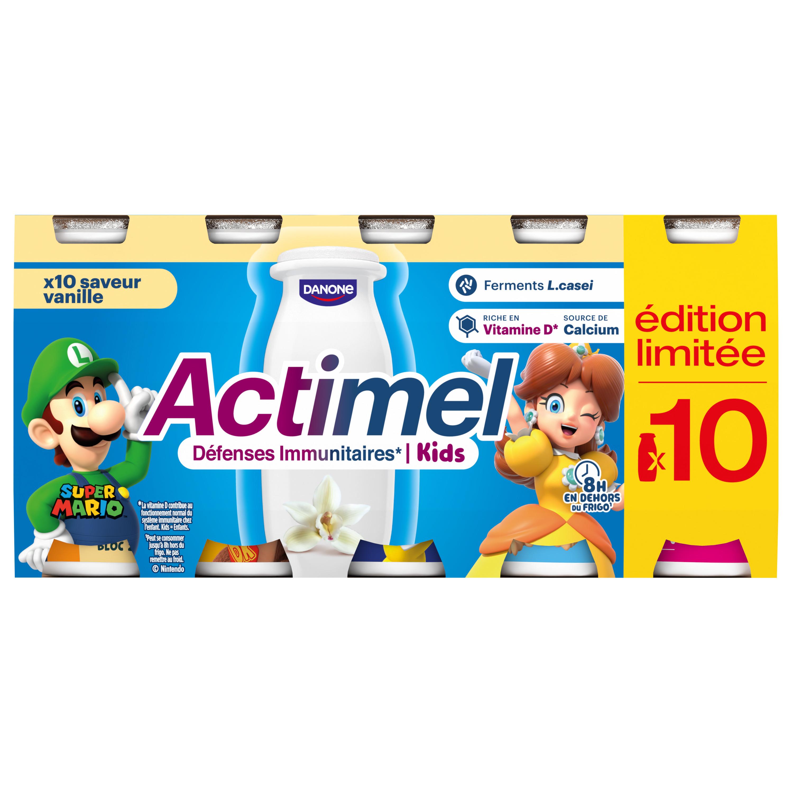 Actimel saveur Vanille, le petit geste immunité* des bonnes journées ! Lorsque tu bois ton Actimel, la vitamine D passe dans ton corps pour atteindre tes cellules immunitaires et les aider à bien fonctionner*. Il est enrichi en vitamine B6 & en calcium et renferme un tas de bonnes choses dont des millions de ferments L.casei exclusifs d'origine naturelle** ainsi que les ferments du yaourt. Son format pratique est un allié de taille tout au long de ta journée car il se garde jusqu'à 8h hors du frigo ! *La vitamine D contribue au fonctionnement normal du système immunitaire chez l'enfant. **Comme tous les ferments du marché.
