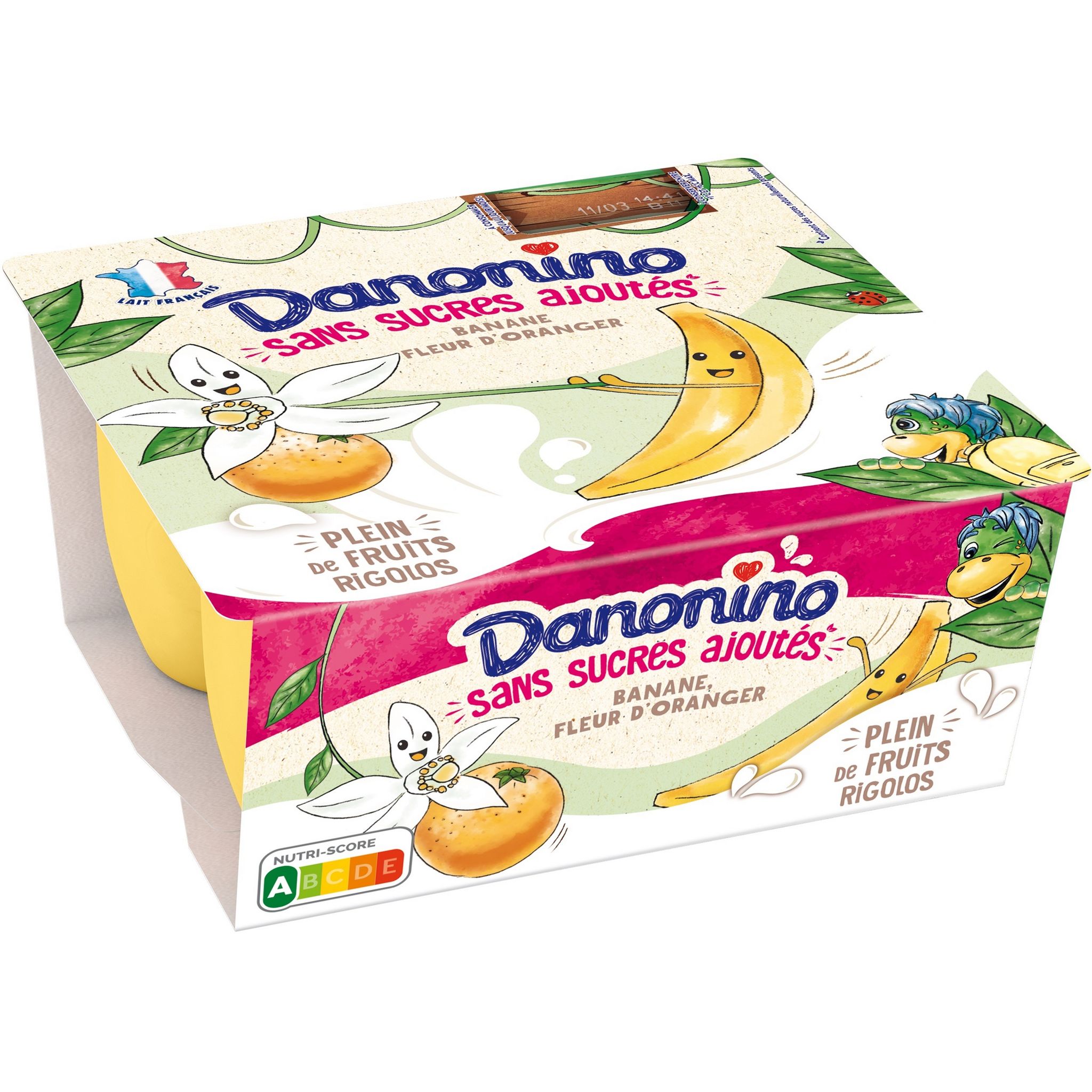 Spécialité laitière à la banane et à la fleur d'oranger, aromatisée Danonino maintenant disponible sans sucres ajoutés! Un petit suisse au bon lait Français, avec 36% de fruits rigolos et... plus assez de place pour ajouter des sucres. Et parce que grandir c’est apprendre à se forger ses propres goûts, Danonino sans sucres ajoutés, c’est un mélange bon et originale pour éveiller la curiosité des enfants à de nouveaux goûts et apporter de la variété! Sans oublier que Danonino sans sucres ajoutés est Nutriscore A.