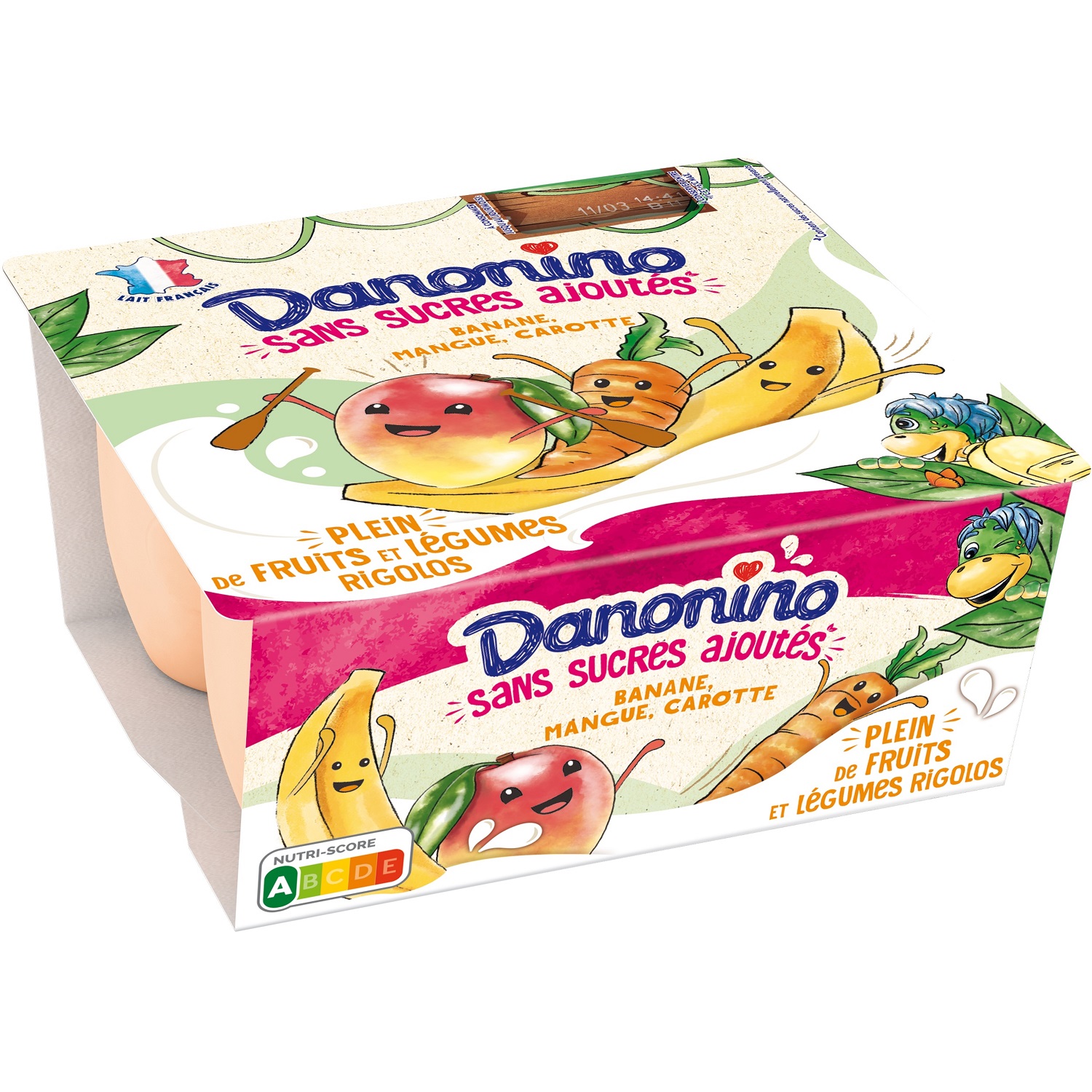 Danonino maintenant disponible sans sucres ajoutés! Un petit suisse au bon lait Français, avec 36% de fruits rigolos et... plus assez de place pour ajouter des sucres. Et parce que grandir c’est apprendre à se forger ses propres goûts, Danonino sans sucres ajoutés, c’est un mélange bon et originale pour éveiller la curiosité des enfants à de nouveaux goûts et apporter de la variété! Sans oublier que Danonino sans sucres ajoutés est Nutriscore A. Spécialité laitière avec fruits et légume, aromatisée
