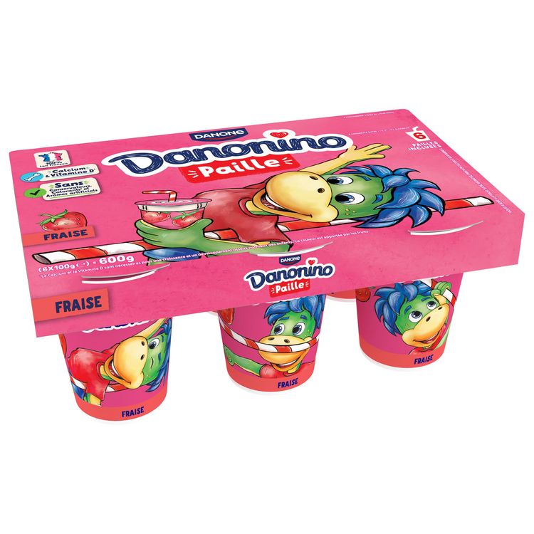 Danonino Paille fraise est un yaourt à boire à la fraise nutriscore B, source de calcium et de vitamine D, pour une croissance osseuse normale des enfants. Ce yaourt à la fraise est fait dans notre laiterie de Le-Molay-Littry (14) avec de bonnes fraises et du bon lait français. Il est sans arômes artificiels, sans colorants* ni conservateurs. Ce yaourt enfant avec sa paille est l'allié du goûter! *La couleur de ce yaourt est apportée par des concentrés de fruits et légumes