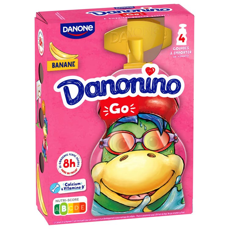 Danonino GO Banane est une spécialité laitière à boire au nutriscore B, source de calcium et de vitamine D, pour une croissance osseuse normale des enfants. Cette recette faible en matière grasse est faite à base de bonnes bananes, sans arômes artificiels, sans colorants* ni conservateurs. Pratique à emporter partout, cette gourde est parfaite pour le goûter de vos enfants et se conserve 8h hors du frigo. *La couleur de ce produit est apportée par les fruits