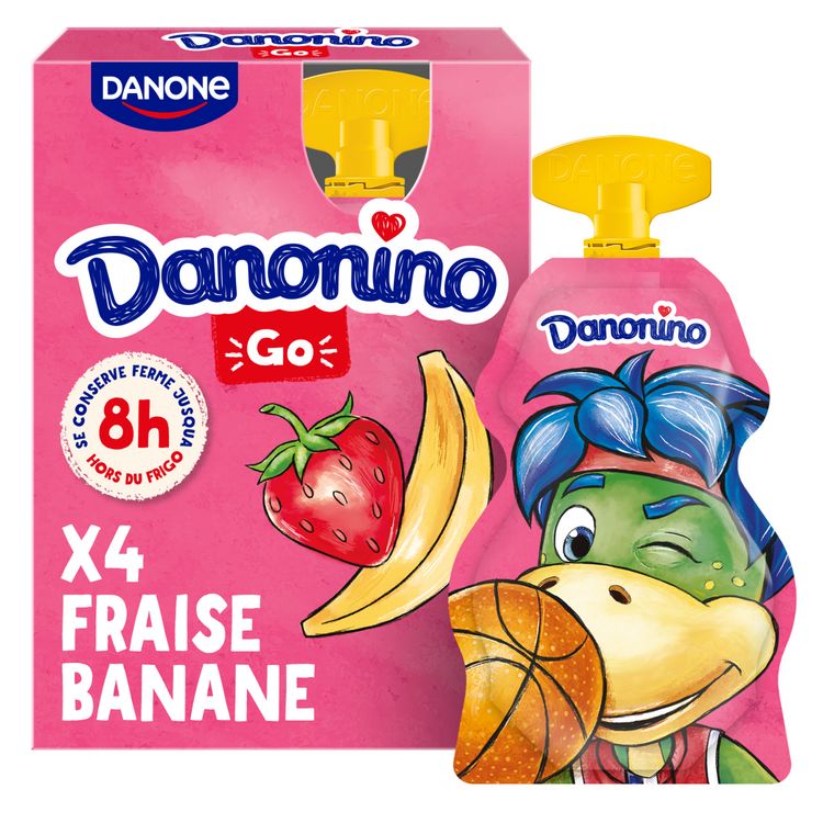 Danonino GO fraise banane est un yaourt à boire au nutriscore B, source de calcium et de vitamine D, pour une croissance osseuse normale des enfants. Cette recette faible en matière grasse est faite à base de bonnes fraises et de bananes, sans arômes artificiels, sans colorants* ni conservateurs. Pratique à emporter partout, cette gourde est parfaite pour le goûter de vos enfants et se conserve 8h hors du frigo. *La couleur de ce produit est apportée par des concentrés de fruits et légumes DANONINO PARTENAIRE OFFICIEL DE PARIS 2024 ! 900 PLACES A GAGNER POUR PARIS 2024 AVEC LE JEU DANONE* *Jeu Danone avec obligation d'achat par instants gagnants jusqu'au 30/06/24 réservé aux personnes majeures dans la limite de 8 participations par foyer. 1 pack acheté = 1 participation. Ticket de caisse à conserver. 450 lots de 2 places en catégorie A, B ou C de 24 à 150€. Dotations et règlement sur jeu.danone.fr/paris2024
