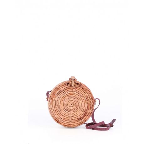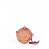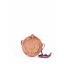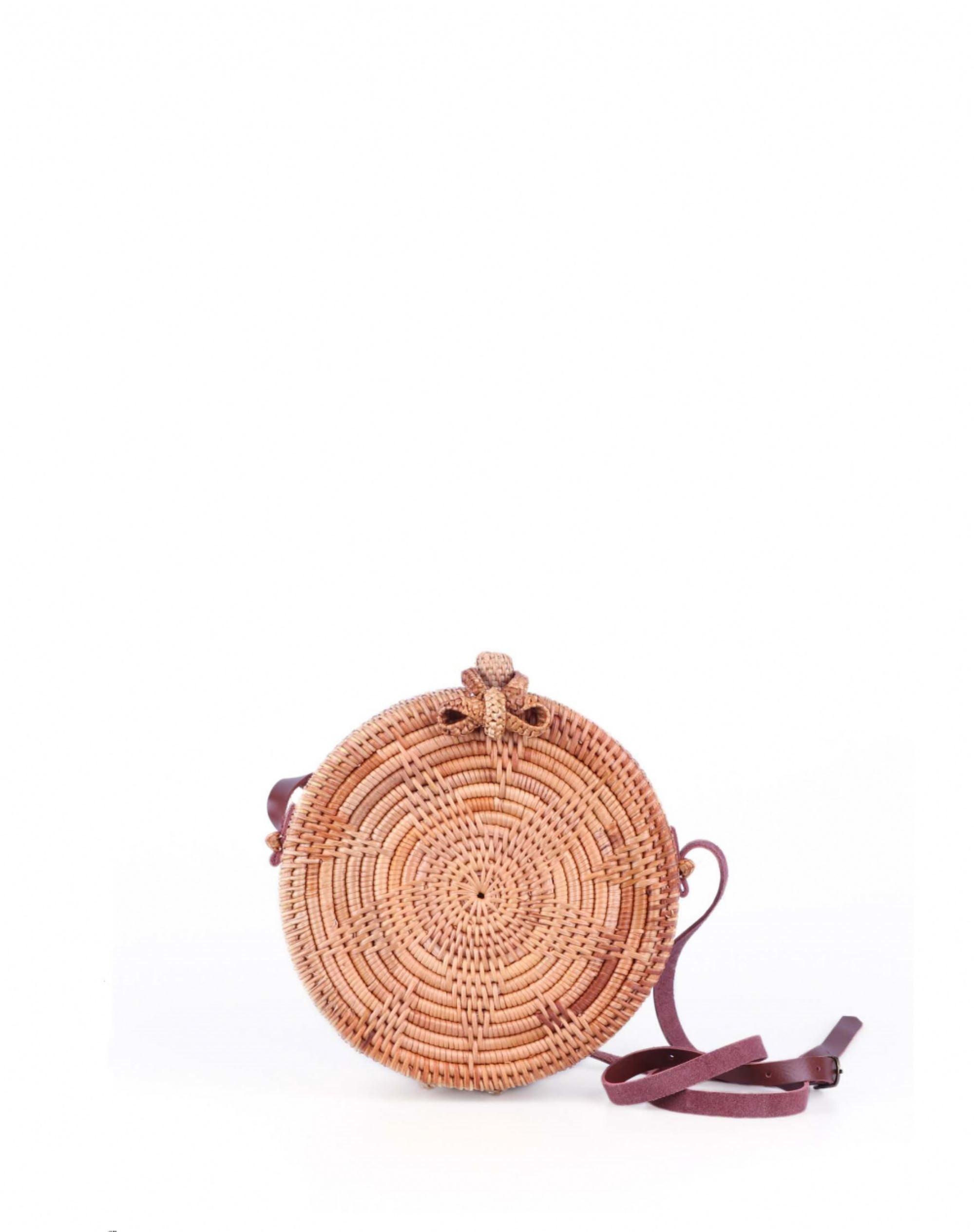 Ce sac SEMINYAK rond en paille est tissé à la main et comporte une belle lanière en cuir brun qui s'ajuste à votre corps.