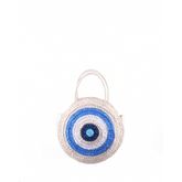Le sac rond en paille JEMELUK de Dari Bali est tissé à la main avec deux poignées en paille tressée et une doublure beige. Il possède une seule poche intérieure et se ferme à l'aide d'un bouton-pression.