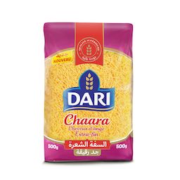 Les cheveux d'ange DARI sont des pâtes utilisées principalement pour la préparation de ""Seffa"", un plat traditionnel très populaire au Maroc. Leur forme bouclée et leur excellente tenue à la cuisson sont particulièrement appréciées des consommateurs. Les chaara sont des cheveux d'ange extra fin.