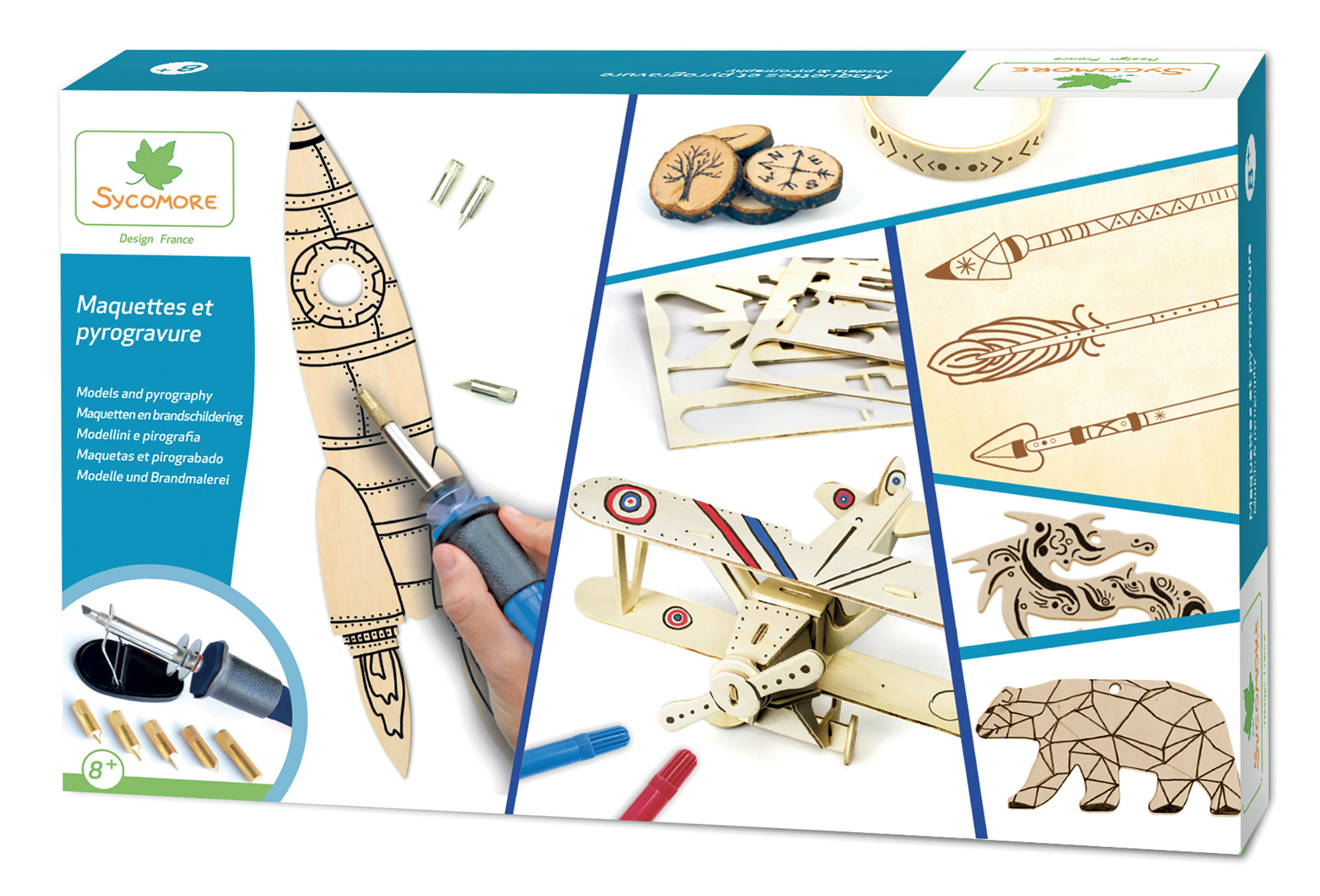 Ce magnifique coffret vous offrira 2 activités manuelles regroupées : la pyrogravure et les maquettes. Vous pourrez réaliser des maquettes d'une fusée ou d'avion. Du côté de la pyrogravure vous pourrez découvrir un ours et un dragon ainsi qu'une planche d'essai.