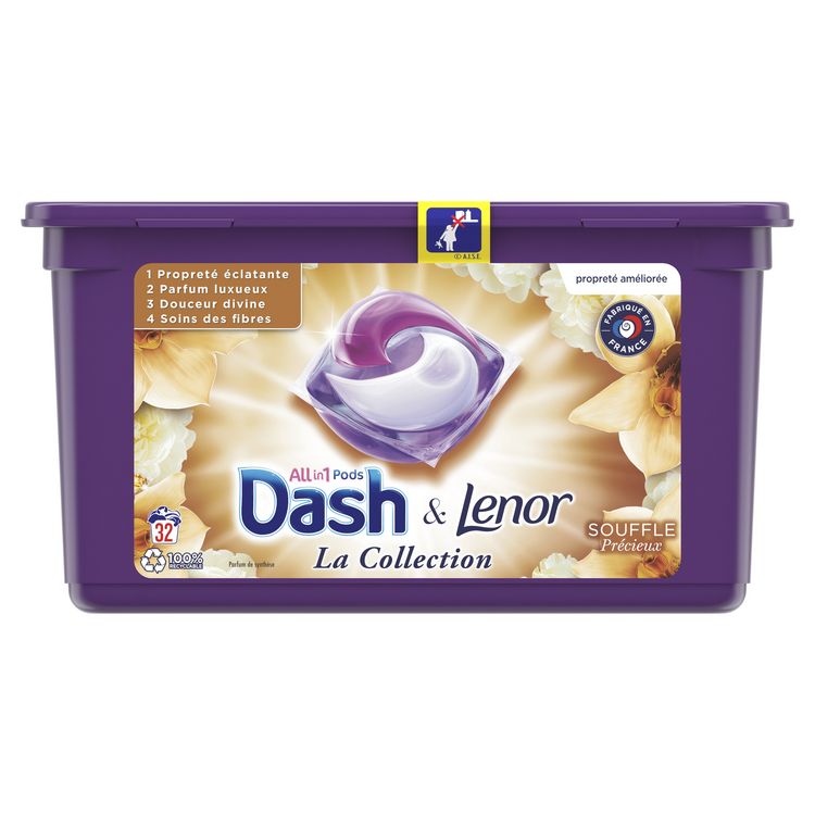 Essayez Dash Allin1 PODS : Expérience irrésistible : 1. Propreté éclatante 2. Parfum luxueux 3. Douceur divine 4. Protection des fibres. La lessive en capsules Dash La Collection Souffle Précieux représente le parfum de l’élégance. Une promesse tacite flotte dans l’air. Séduisante et luxueuse. Cette lessive ne capsules possède l’élégance de la soie qui n’en révèle pas plus qu’il ne le faut. Souffle Précieux est imprégné d’une touche séduisante de vanille délicate qui réconforte et détend. Mélangeant du mimosa, des accords de rose, de miel et de pêche crémeuse, Dash Allin1 Souffle Précieux constitue une expérience incroyable et somptueuse. Dash Allin1 Souffle Précieux a été créé pour fonctionner en parfaite harmonie avec l’adoucissant et le parfum de linge en perles Lenor Souffle Précieux, utilisez-les ensemble pour une routine de lessive idéale. AVERTISSEMENT. Ce produit peut être dangereux et causer des blessures graves. Conservez les Dash Pods Allin1 hors de portée des enfants. Consultez keepcapsfromkids.eu pour en savoir plus. Dash Allin1 Pods La Collection Souffle Précieux Lessive En Capsules 32 Lavages